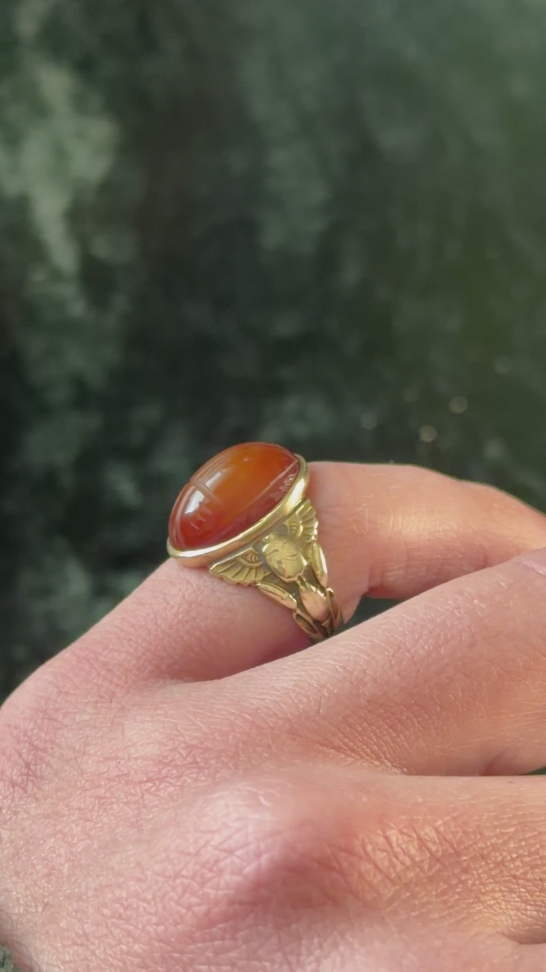Rare Art Deco era 10k gold Egyptian Revival ring featuring a carved carnelian scarab. In ancient Egypt, the scarab represented the rising sun, transformation, and the eternal cycle of rebirth. The setting depicts a finely detailed winged scarab motif along the shoulders, with lotus buds rising along the band.
