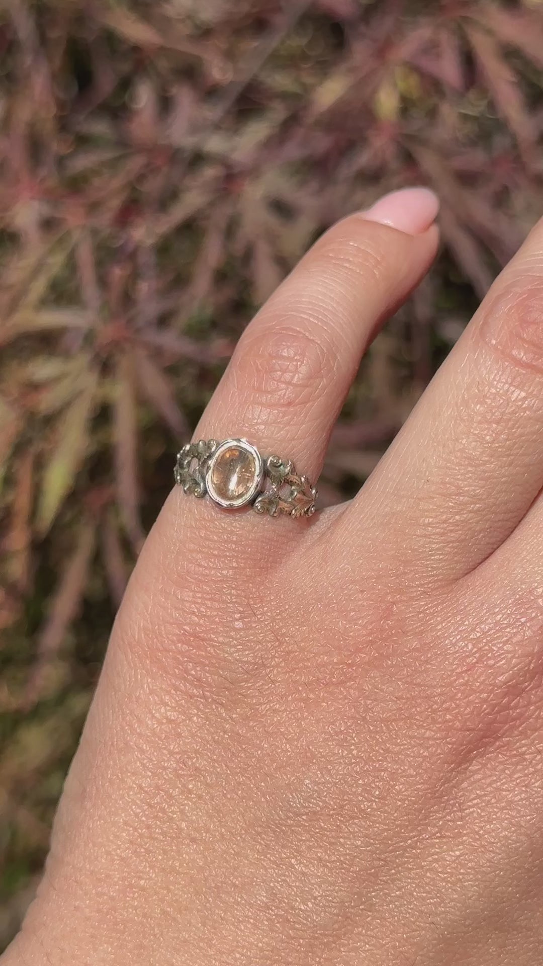 Antique 14k gold Georgian era ring set with a foiled citrine stone. The band showcases intricate openwork scroll and foliate details, evoking the elegance of fine 19th-century craftsmanship. The citrine radiates soft hues of golden honey and amber.