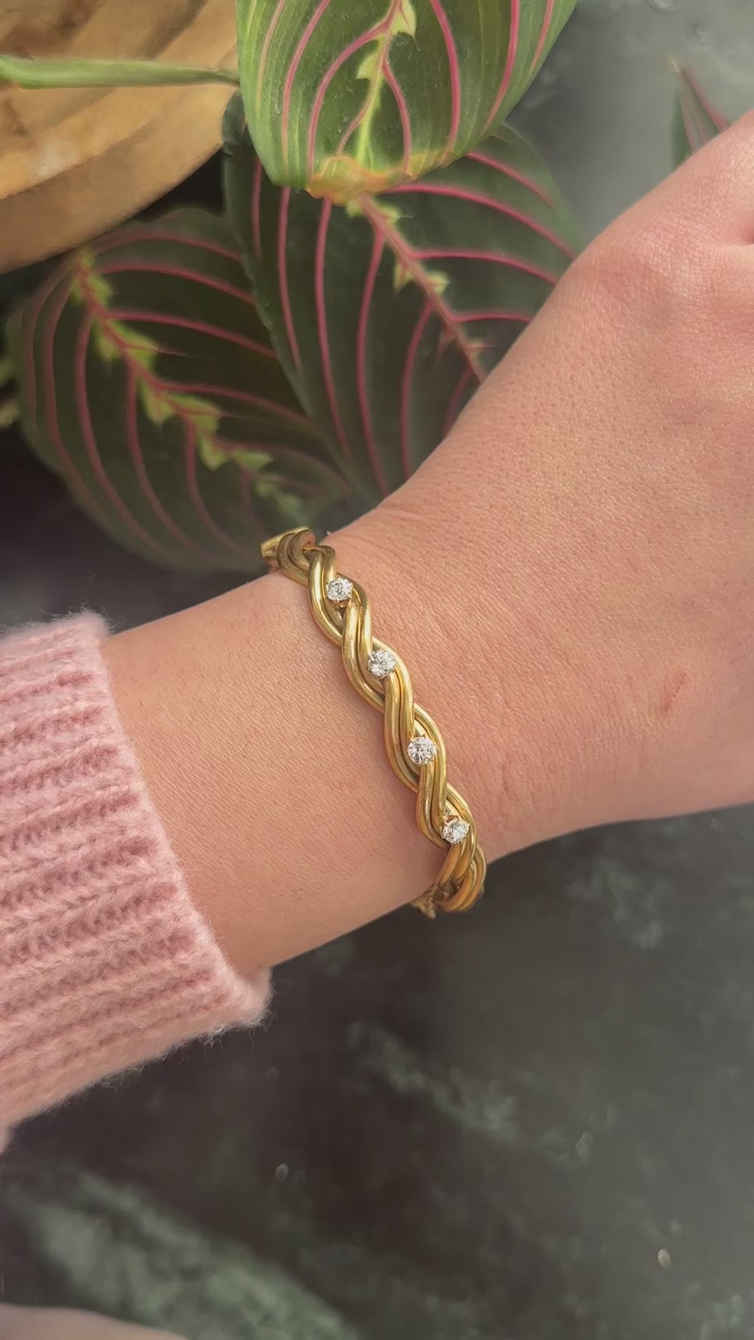 Rare antique 14k gold hinged bangle bracelet with approximately 1.00 ctw of Old European Cut diamonds. The bracelet has a unique woven design. Closes with a hidden box clasp. Safety chain intact.